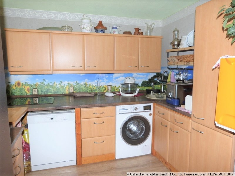 Bei Bedarf kann auch der vorhandene Kachelofen im Wohnzimmer als zusätzliche Heizquelle wieder in Betrieb genommen werden.