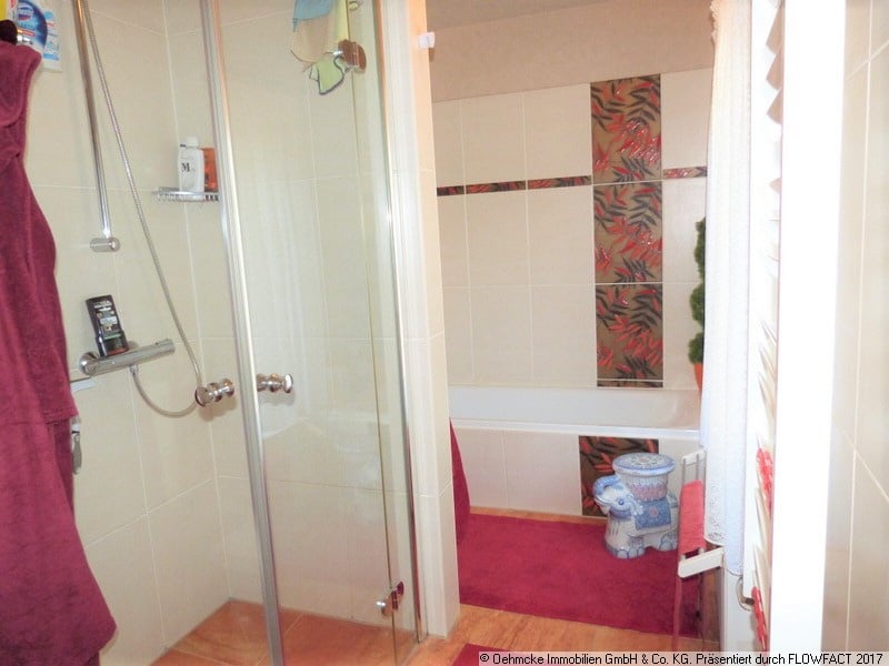 Von der Diele aus rechtsseitig liegt das exklusive Badezimmer, welches fast deckenhoch gefliest ist und mit Wanne und bodengleicher Dusche ausgestattet ist.
