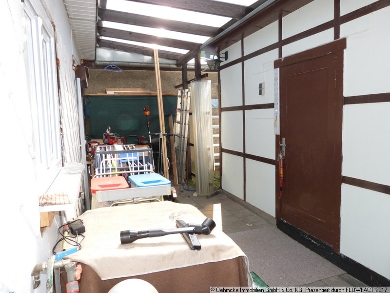 Neben dem Einfamilienhaus auf der linken Seite befindet sich ein überdachter Wirtschaftsbereich mit Zugang zum Nebengebäude. Hier stehen mit 2 Räumen etwa 25 m² Nutzfläche zur Verfügung. Zusätzlich wurde 2017 noch ein kleiner, sehr ansprechender Gästebungalow errichtet.
