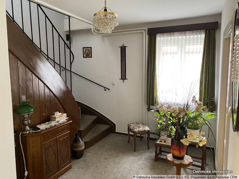 Eine viertelgewendelte Massivholztreppe führt zum Obergeschoss; hier gelangt man zunächst in einen kleinen Flur. Sowohl die Diele, als auch der Flur im Obergeschoss sind durch ein Fenster tagesbelichtet. Im Obergeschoss liegen 3 Zimmer und das Bad. Durch eine Dachluke gelangt man mit einer Leiter in den darüberliegenden Dachboden. Das Bad ist gefliest und mit einer Wanne, WC, Waschbecken und Handtuchtrockner ausgestattet.